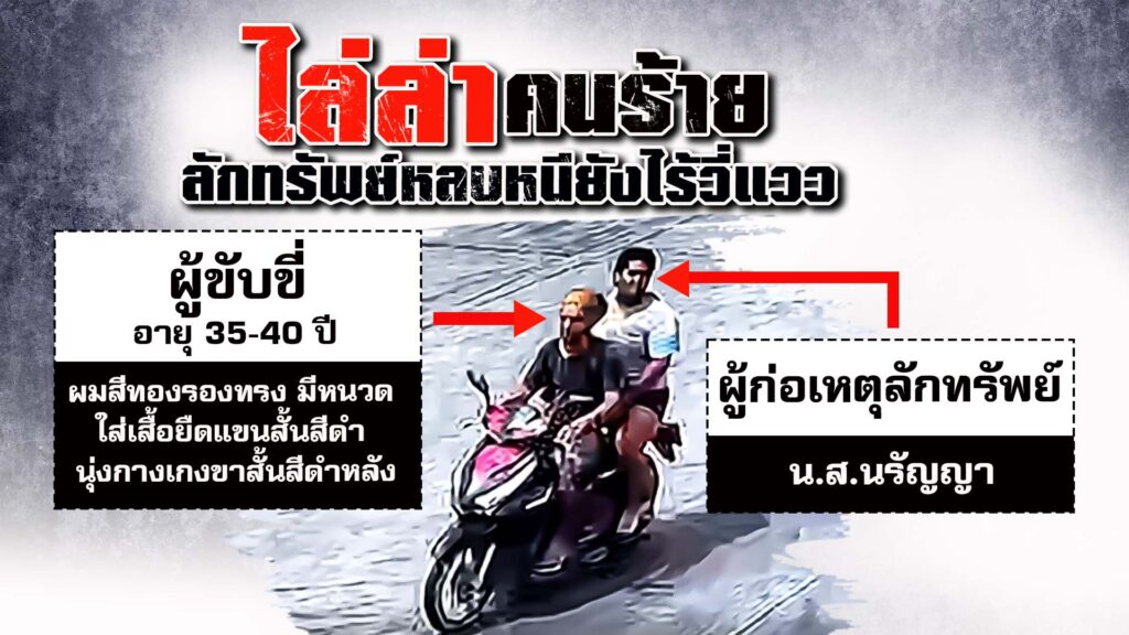 ภาพจากกล้องวงจรปิดเผยเหตุการณ์ชายอายุประมาณ 35-40 ปี ผมสีทอง มีหนวด สวมเสื้อยืดแขนสั้นสีดำ กางเกงขาสั้นสีดำ ขี่รถจักรยานยนต์พา น.ส.นรัญญา อายุ 20 ปี ผู้ต้องหาก่อเหตุลักทรัพย์สุรานอก 2 ขวด ในห้างสรรพสินค้าแห่งหนึ่ง สาขาสัตหีบ จ.ชลบุรี หลบหนีออกมาจากสถานีตำรวจภูธรเมืองสัตหีบ ในขณะที่ตำรวจขับรถติดตามอย่างกระชั้น และวิทยุสั่งการให้สกัดจับรถจักรยานยนต์ฮอนด้า คลิก สีดำ ไม่ทราบทะเบียน แต่จนถึงตอนนี้ยังไม่สามารถจับกุมตัวได้