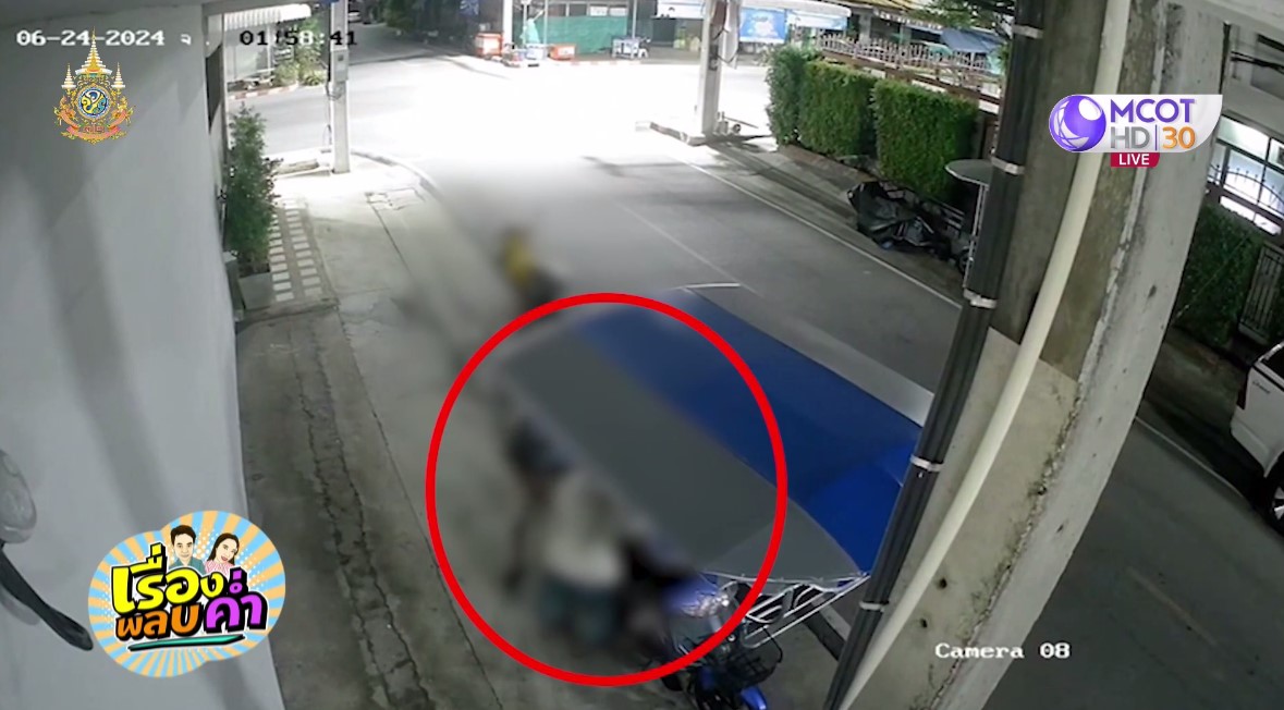 จากนั้นทั้ง 2 คน ขี่รถวนกลับมาอีกรอบ คนซ้อนท้ายถือสายยางและขวดน้ำพลาสติก เดินไปที่รถจักรยานยนต์พ่วงข้าง เปิดเบาะรถแล้วใช้สายยางดูดน้ำมันใส่ขวดจนเต็ม 2 ขวด ก่อนรีบขี่รถหลบหนีไป