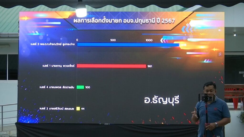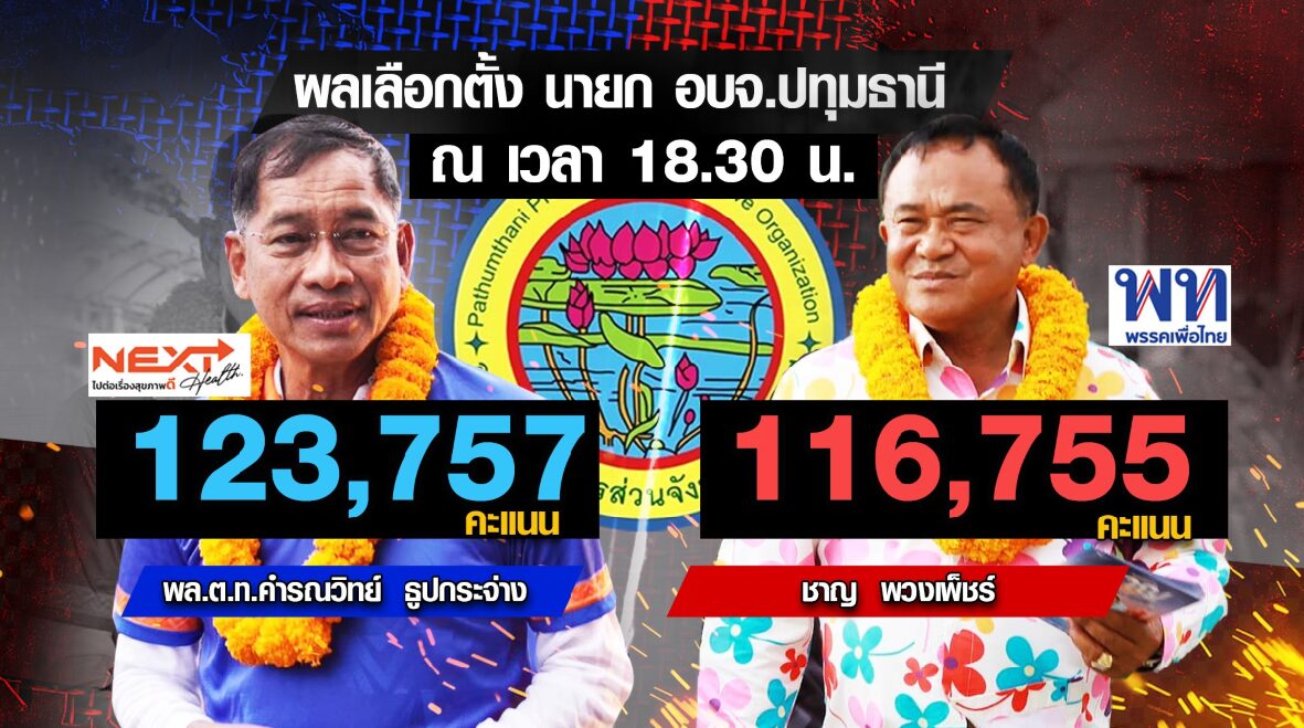 ปทุมธานี 30 มิ.ย. – การเลือกตั้งนายก อบจ.ปทุมธานี ผลคะแนนของผู้สมัครเบอร์ 1 คือ นายชาญ สังกัดพรรคเพื่อไทย ขับเคี่ยวสูสีกับ พล.ต.ท.คำรณวิทย์ ชนิดต่างฝ่ายต่างระบุต้องลุ้นจนถึงที่สุด จนกว่าคะแนนชัดเจนจึงจะยอมเปิดใจกับสื่อมวลชน