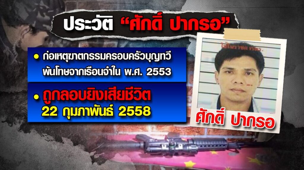 ศักดิ์ ปากรอ หรือนายเรืองศักดิ์ ทองกุล ผู้ต้องหาในคดีดังเมื่อปี 2540 ด้วยการฆ่าโหดยกครัวแขวนคอ 5 ศพครอบครัวบุญทวี เหตุเกิดที่ ต.ชิงโค อ.สิงหนคร จ.สงขลา เพื่อปล้นเงิน 1 ล้านบาท แต่เมื่อพ้นโทษออกมา “ศักดิ์ ปากรอ” ได้เปลี่ยนชื่อและนามสกุลใหม่ และถูกยิงเสียชีวิต เมื่้อวันที่ 22 ก.พ.58 ในพื้นที่ อ.สะเดา จ.สงขลา