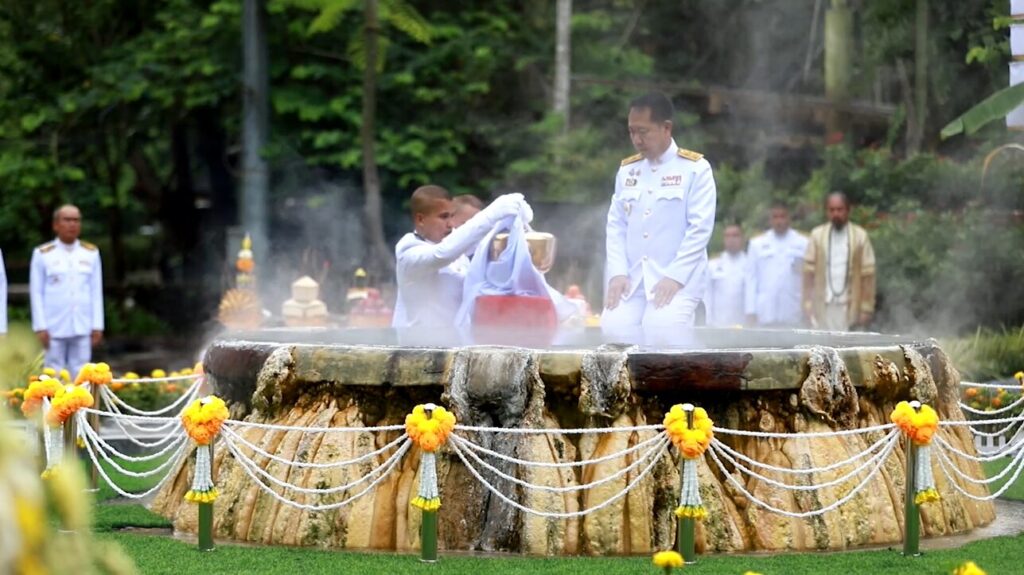 ที่บ่อน้ำแร่ร้อนรักษะวาริน บ่อน้ำแร่ร้อนแหล่งเดียวในประเทศไทย ที่ไม่มีสารกำมะถันเจือปน ผู้ว่าราชการจังหวัดระนอง ทำพิธีพลีกรรมตักน้ำจากแหล่งน้ำศักดิ์สิทธิ์ เพื่อจัดทำน้ำพระพุทธมนต์ โดยเชิญขันสาครและที่ตักน้ำ ประจำรถบุษบก ก่อนเคลื่อนขบวนไปยังวัดสุวรรณคีรีวิหารพระอารามหลวง สถานที่ประกอบพิธีเสกน้ำพระพุทธมนต์ศักดิ์สิทธิ์ .-สำนักข่าวไทย