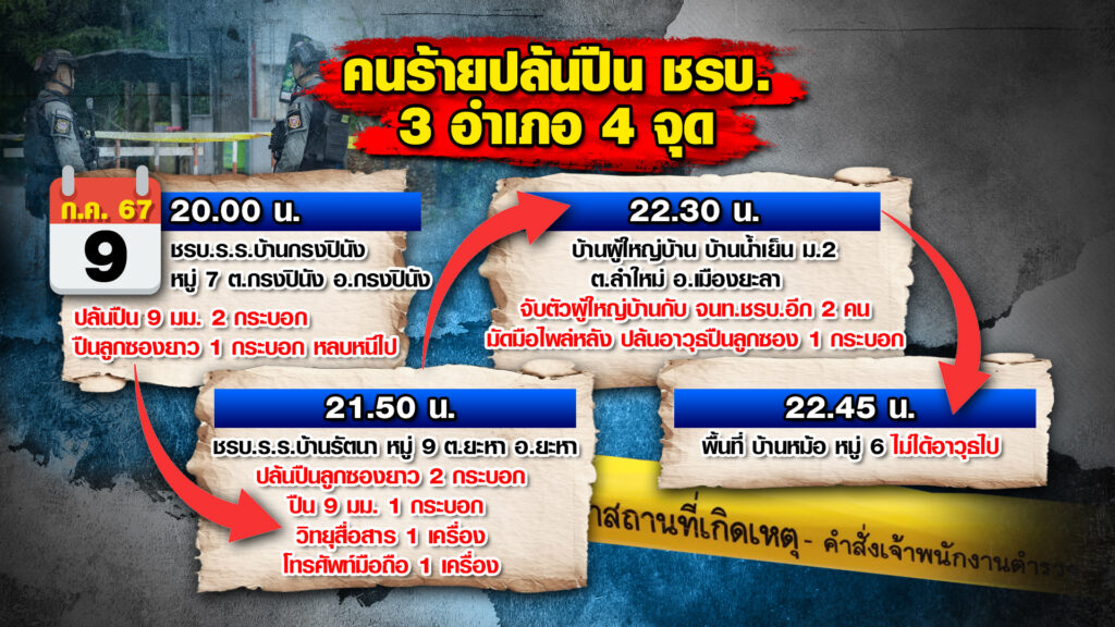 ยะลา 12 ก.ค.- ย้อนไทม์ไลน์ขบวนการปล้นปืนชุด ชรบ.ยะลา 4 จุด เปิดวงจรปิดล่าสุดพบแต่งกายคล้ายทหารพราน เร่งแกะรอยทุกเส้นทางล่าตัวมาดำเนินคดี