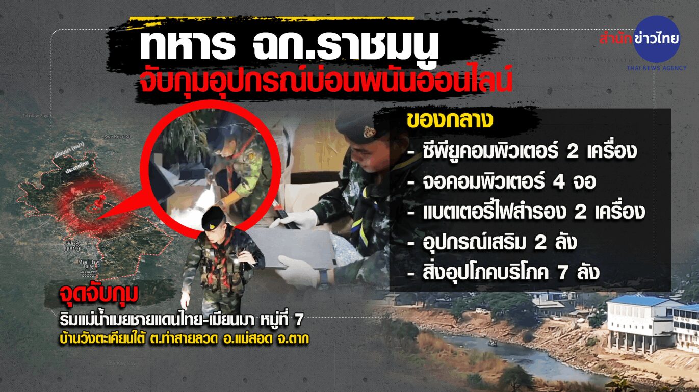ตาก 15 ก.ค. – ทหารเฉพาะกิจราชมนู ตรวจยึดอุปกรณ์บ่อนพนันออนไลน์ทั้งกลางคืนและกลางวัน คาดกำลังย้ายฐานจากชายแดนแม่สอด จ.ตาก ไปชายแดนอรัญประเทศ จ.สระแก้ว