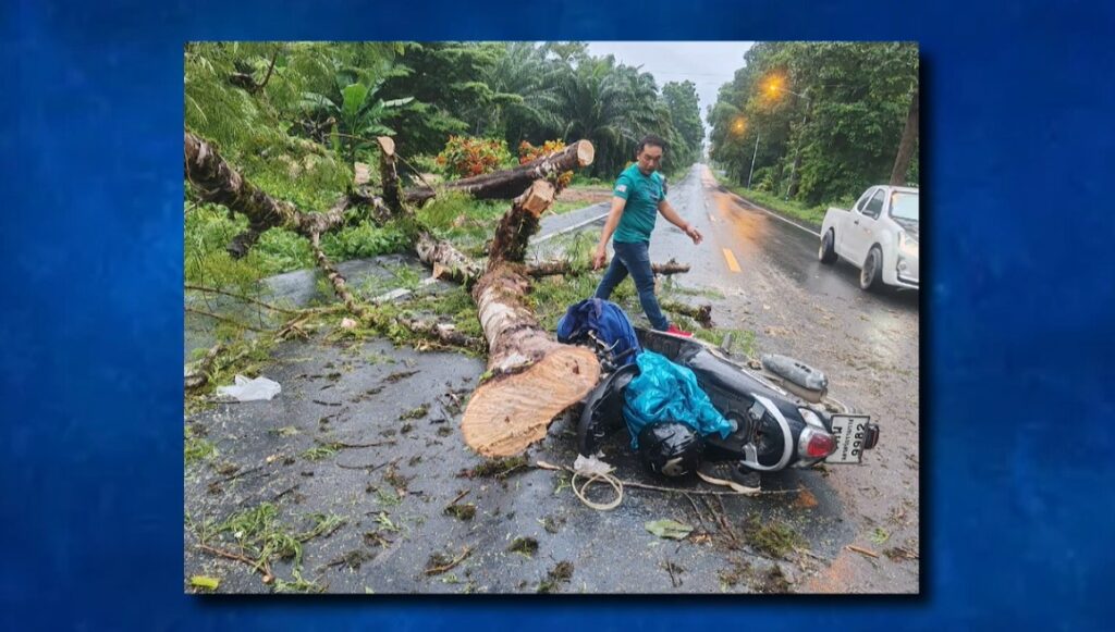 นางฐานิดา ภรรยาผู้ได้รับบาดเจ็บ เล่าว่า สามีขี่รถจักรยานยนต์เพื่อไปทำงานที่โรงแรมในพื้นที่เขาหลัก อ.ตะกั่วป่า ระหว่างนั้นเกิดฝนตกหนัก ลมแรงพัดต้นไม้ขนาดใหญ่ล้มลงมาทับรถจักรยานยนต์ของสามี ถูกบริเวณศีรษะพอดี ทำให้หมวกกันน็อกแตก ได้รับบาดเจ็บสาหัส