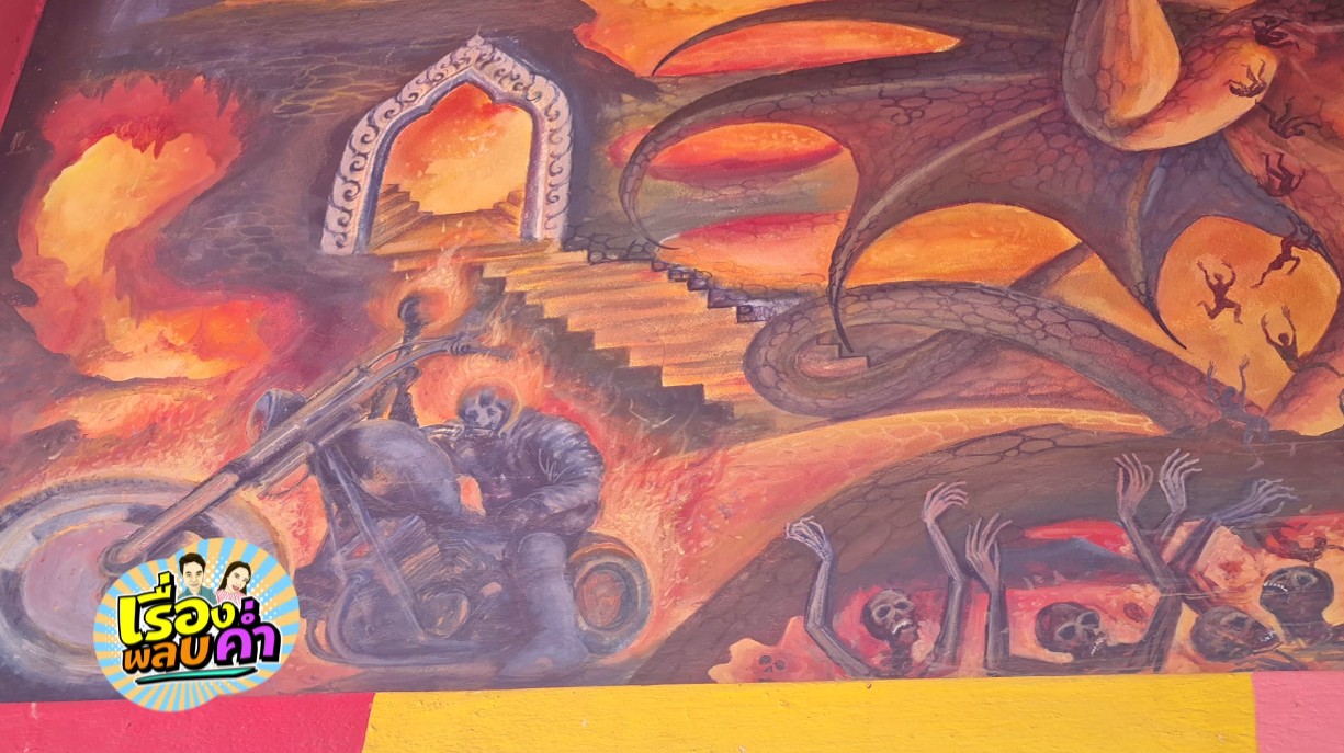 ภาพในเมรุเป็นยมทูตขับขี่ยานพาหนะต่างๆ เพื่อรับดวงวิญญาณ เช่น ยมทูตโกสต์ไรเดอร์ขี่ชอปเปอร์เพลิงรับดวงวิญญาณที่ทำความชั่วไปยังนรก และยมทูตขับรถเบนซ์รับดวงวิญญาณที่ทำความดีไปยังสวรรค์ ผู้บำเพ็ญเพียรยังได้รับการพาขึ้นเครื่องบินไปยังสวรรค์ชั้นสูง