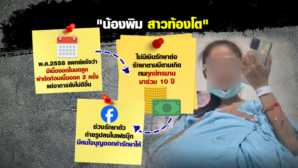 ทางครอบครัวหมดเงิน จำต้องรักษาตามมีตามเกิด แบบหมอพื้นบ้าน เนื่องจากไม่มีเงินกลับเข้ามารักษาต่อเนื่องในฝั่งไทย ต้องทนทุกข์ทรมานมาร่วม 10 ปี ซึ่งน้องสาวถอดใจยอมรับสภาพว่าไม่มีทางรักษา ช่วงมารักษาตัวอยู่บ้านแรกๆ คาดว่าจะมีชีวิตอยู่ได้ไม่ถึงปี และมีอาการท้องโตขึ้นเรื่อยๆ ทางครอบครัวสงสัยว่าถ้าหากเป็นมะเร็งจริงไม่น่าจะมีชีวิตรอดอยู่ได้ขนาดนี้ น่าจะเสียชีวิตตั้งแต่ 3-6 เดือนแรกแล้ว จึงถ่ายรูปลงเฟซบุ๊ก ยูทูบเบอร์สายบุญชาว สปป ลาว 2 คน ช่องสาวกึ่ม ใจสะหว่าง และบ่าวพามี นำไปแชร์ต่อ จนแฟนคลับที่ติดตามช่องรับรู้เรื่องราว เช่น ใน สปป ลาว สหรัฐอเมริกา นอร์เวย์ ช่วยกันบริจาคค่าผ่าตัด ให้ไปตรวจรักษาที่โรงพยาบาล จ.มุกดาหาร และถูกส่งต่อมายังโรงพยาบาลศรีนครินทร์ จ.ขอนแก่น ต้องขอบคุณโรงพยาบาลศรีนครินทร์ ที่แจ้งว่าไม่ต้องห่วงค่ารักษาพยาบาลที่อยู่ประมาณ 10,000-100,000 บาท เพราะให้ผ่อนชำระได้ และแม้ไม่มีจะรักษาอย่างเต็มที่ โดยจะใช้เวลาผ่าตัดนานถึง 24 ชั่วโมง