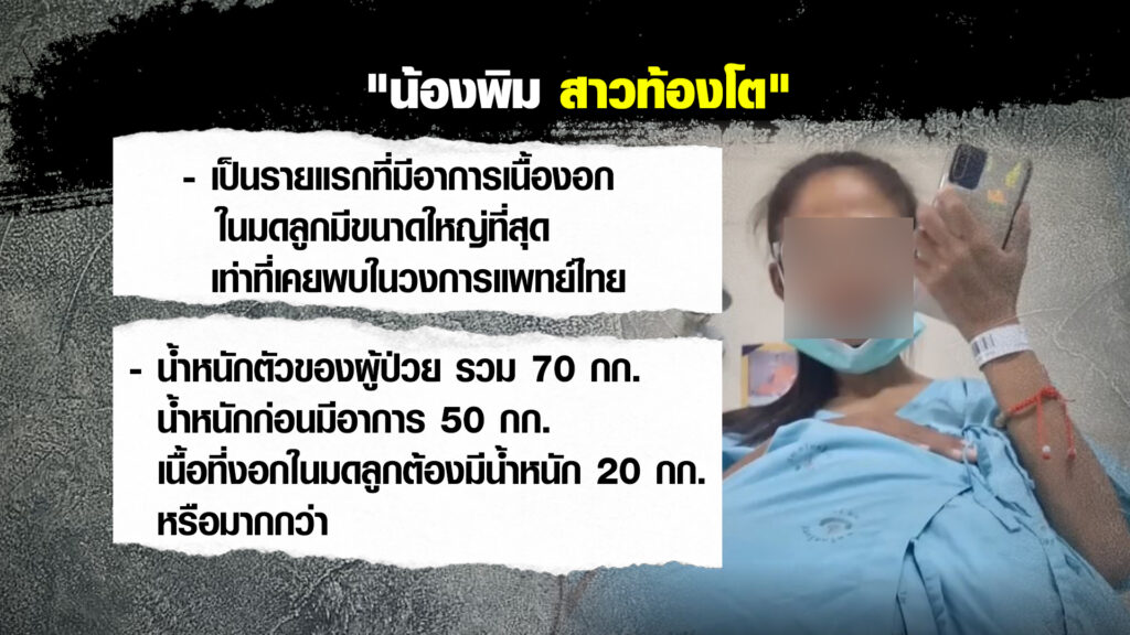 สำหรับการรักษาน้องพิม สาว สปป ลาว ท้องโต ถือได้ว่าเป็นรายแรกที่มีอาการเนื้องอกในมดลูกที่มีขนาดใหญ่ที่สุดเท่าที่เคยพบในวงการแพทย์ไทย เนื่องจากน้ำหนักตัวของผู้ป่วยมีน้ำหนักรวม 70 กิโลกรัม ซึ่งน้ำหนักก่อนมีอาการหนักเพียง 50 กิโลกรัม เท่ากับว่าเนื้อที่งอกในมดลูกต้องมีน้ำหนัก 20 กิโลกรัม หรือมากกว่า ซึ่งทางคณะแพทย์โรงพยาบาลศรีนครินทร์ จะผ่าตัดเอาเนื้องอกออก และวินิจฉัยโรค วันที่ 25 กรกฎาคมนี้