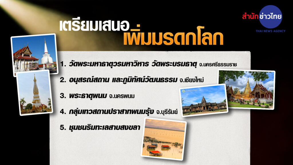 - สงขลา และชุมชนที่เกี่ยวเนื่องริมทะเลสาบสงขลา (ขึ้นบัญชีเบื้องต้นเมื่อวันที่ 26 กรกฎาคม 2567) โดยล่าสุดเพิ่งได้รับการพิจารณาจากคณะกรรมการมรดกโลกเข้าสู่บัญชีรายชื่อเบื้องต้น ในการประชุมที่กรุงนิวเดลี ประเทศอินเดีย .-สำนักข่าวไทย