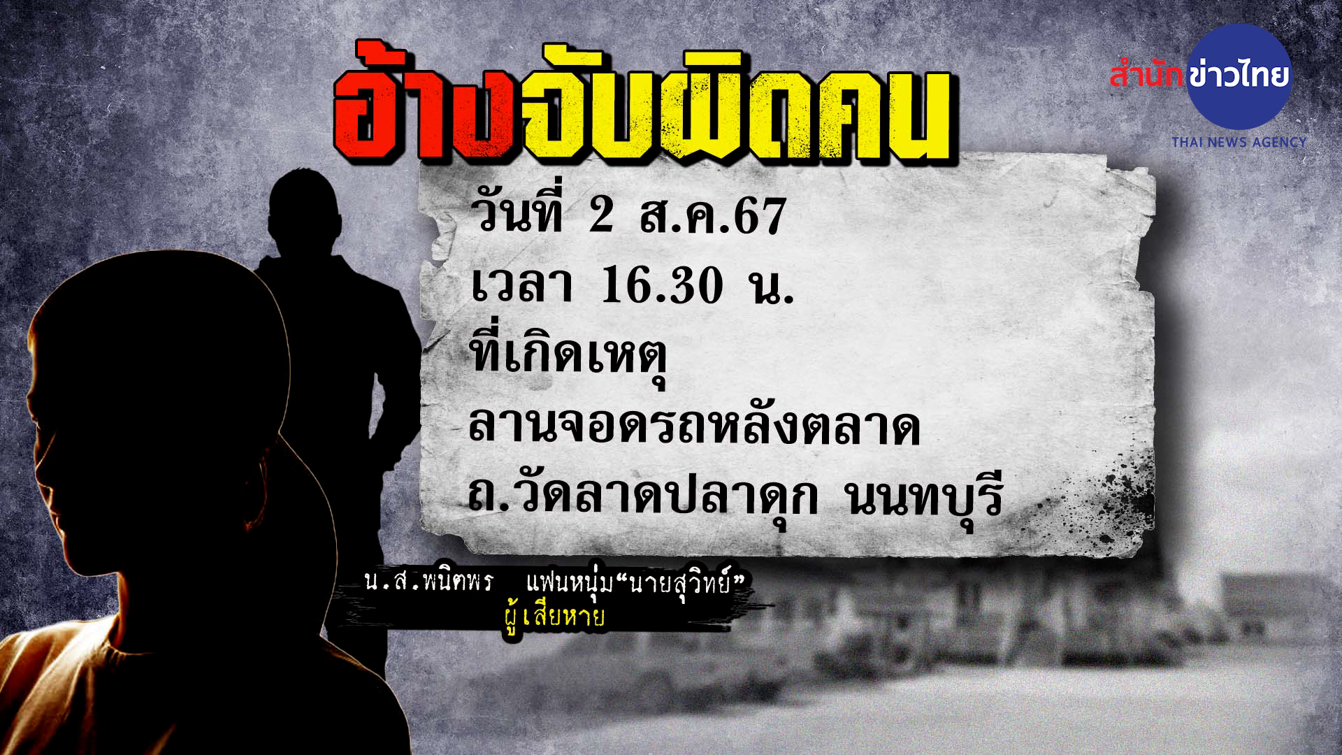 หลังเกิดเหตุ ผู้สื่อข่าวลงพื้นที่และติดต่อ น.ส.พนิตพร หรือแก้ว อายุ 32 ปี เจ้าของโพสต์ เพื่อสอบถามข้อมูล แต่ น.ส.แก้ว ขอให้ข้อมูลทางโทรศัพท์ โดยเหตุเกิดที่ลานจอดรถ หลังตลาด ถ.วัดลาดปลาดุก อ.บางบัวทอง เมื่อเวลา 16.30 น. วันที่ 2 ส.ค.ที่ผ่านมา ตนและครอบครัวไปซื้อของที่ตลาด จอดรถเอาไว้หลังตลาด พาพ่อไปหาหมอที่คลินิคหน้าตลาด ขณะที่นายสุวิทย์ อายุ 35 ปี แฟนเดินกลับมาจากตลาด ปรากฏว่ากลุ่มชายฉกรรจ์ 10-15 คน เข้ามาล้อมและบอกว่าเป็นตำรวจ ซึ่งกลุ่มชายฉกรรจ์ทั้งหมด ไม่มีใครใส่ชุดตำรวจ ส่วนตัวคิดว่าคงเป็นสายสืบแต่พอขอดูบัตรก็ไม่มีใครให้ดู จากนั้นมีตำรวจถามแฟนตนว่า “เมื่อคืนไปทำอะไรมา” และหันไปหาลุงที่สวมเสื้อสีเขียวและถามว่าใช่คนนี้ใช่ไหม หลังจากนั้นก็มีเจ้าหน้าที่พาลุงที่สวมเสื้อสีเขียวเดินออกไป เจ้าหน้าที่ค้นตัวแฟนและขอค้นรถ แต่บอกไปว่าถ้าแฟนตนทำผิดจริงก็พาตัวไปโรงพัก หลังจากถูกค้นตัว 10 นาที เจ้าหน้าที่ก็บอกว่าผิดตัว ไม่ใช่คนนี้พร้อมกับขอโทษและพากันกลับออกไป สร้างความสงสัยให้ตนและครอบครัวอย่างมาก ว่า เจ้าหน้าที่ทำงานแบบนี้ได้หรือ ยืนยันสงสัยในขั้นตอนการทำงานของเจ้าหน้าที่ และตัวลุงที่สวมเสื้อสีเขียวที่ชี้ตัวให้เจ้าหน้าที่เข้ามาค้นตัวแฟนตน โดยบอกว่าเป็นคนร้าย ชี้ตัวเสร็จแล้วก็หายตัวไปเลย ตอนนี้อยากให้ลุงคนนั้นเข้ามาขอโทษครอบครัวตน สิ่งที่เกิดขึ้นทำให้คนที่รู้จักเข้าใจผิดคิดว่าครอบครัวทำเรื่องไม่ดี
