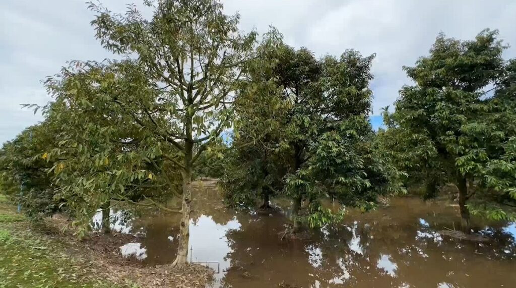 นายบุญอยู่ อายุ 62 ปี เจ้าของสวนทุเรียนที่ได้รับผลกระทบจากน้ำท่วมขังในพื้นที่ ต.วังแซ้ม อ.มะขาม จ.จันทบุรี นาน 5 วัน เล่าว่า ต้นทุเรียนอายุ 1-4 ปี มีสภาพใบเหลือง และทยอยยืนต้นตาย ส่วนต้นทุเรียนอายุ 5 ปีขึ้นไป หลังจากนี้อาจต้องเผชิญกับโรคเชื้อรา รากเน่า โคนเน่า ชาวสวนเองต้องเร่งหาองค์ความรู้เพื่อฟื้นฟูต้นทุเรียนที่เหลืออยู่ ประเมินความเสียหายทั้งหมด 60-80 ต้น โดยปกติฝนจะตกหนักช่วงวันที่ 27-28 กรกฎาคม และจะระบายน้ำออกภายใน 1-2 วัน แต่ปีนี้กลับระบายออกช้า ทิ้งช่วง ทำให้ทุเรียนแช่น้ำนานถึง 5 วัน ส่วนในอนาคตยังตัดสินใจไม่ได้ว่าจะปลูกใหม่ทดแทน หรือเปลี่ยนไปปลูกพืชที่ทนน้ำทดแทน หลังจากนี้คาดว่าหน่วยงานที่เกี่ยวข้องจะเข้ามาสำรวจความเสียหายช่วยเหลือเยียวยา และหาทางแก้ไขระบายน้ำในพื้นที่ให้ไหลออกสู่แม่น้ำจันทบุรี รวดเร็วกว่าครั้งนี้
