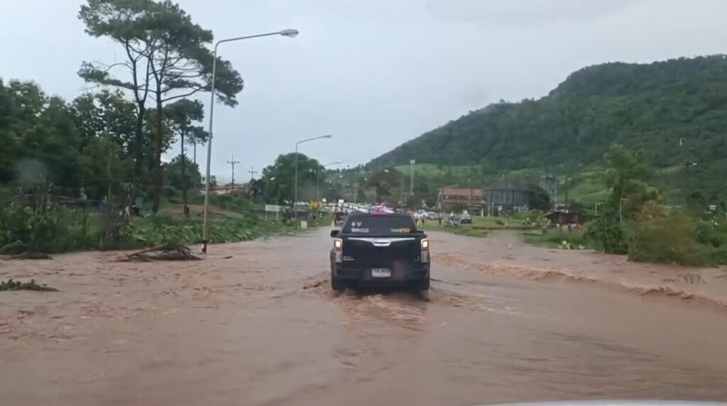น้ำป่าทะลักท่วมถนนสายเลย-ภูเรือ รถติดยาวเยียด