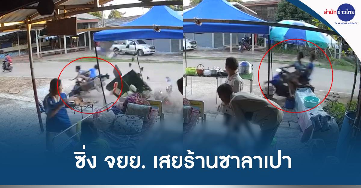 สกลนคร 10 ส.ค.-เปิดร้านขายซาลาเปาวันแรก ไม่ทันนาทีเจอเด็กขี่รถจักรยานยนต์พุ่งชนเหมาแผง ข้าวของเสียหาย