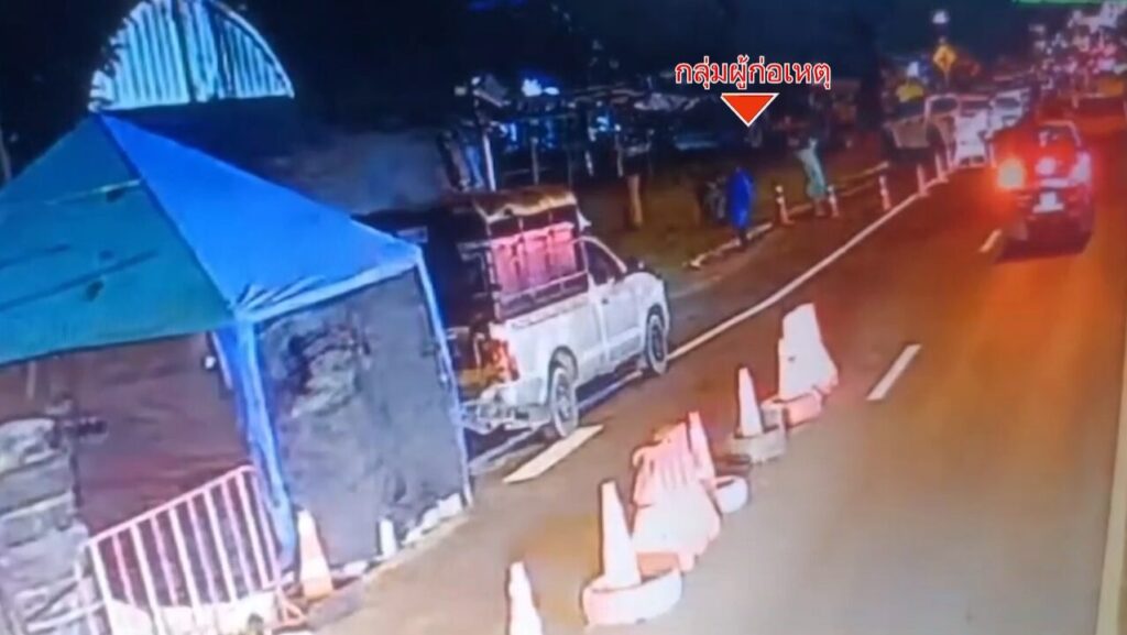 ระเบิดลูกแรก ตกไปที่โรงเรือนแล้วระเบิดขึ้น ส่วนอีกลูก ตกลงที่บริเวณเต็นท์หน้าจุดตรวจริมถนน แล้วเกิดระเบิดตามมา จุดนี้มีรถกระบะจอดอยู่ใกล้ๆ ด้วย นอกจากนี้ ยังมีคนร้ายอีก 2 คน เดินมาจากอีกมุมหนึ่ง (ไม่เห็นภาพในวงจรปิด) ได้ขว้างระเบิด อีกคนละ 1 ลูก เข้าไปในจุดตรวจ แต่ระเบิดไม่ทำงาน 1 ลูก สรุปมีคนร้าย 4 คน ขว้างระเบิด 4 ลูก ระเบิดไม่ทำงาน 1 ลูก