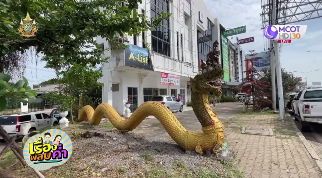 ผู้สื่อข่าวได้ลงพื้นที่ไปอาคารพาาณิชย์ 4 ชั้นครึ่ง ดังกล่าว ริมถนนมิตรภาพ ต.ในเมือง อ.เมือง จ.ขอนแก่น พบกับนางนิตยา เจ้าของอาคารพาณิชย์ พาเดินดูพญานาค ซึ่งตั้งอยู่บริเวณที่ดินเปล่าข้างอาคาร ความยาวประมาณ 10 เมตร สูงประมาณ 2 เมตร ทาสีทองอร่ามทั้งตัว ที่เศียรเล็กมีรอยหัก และมีขวดน้ำพร้อมพวงมาลัยวางอยู่