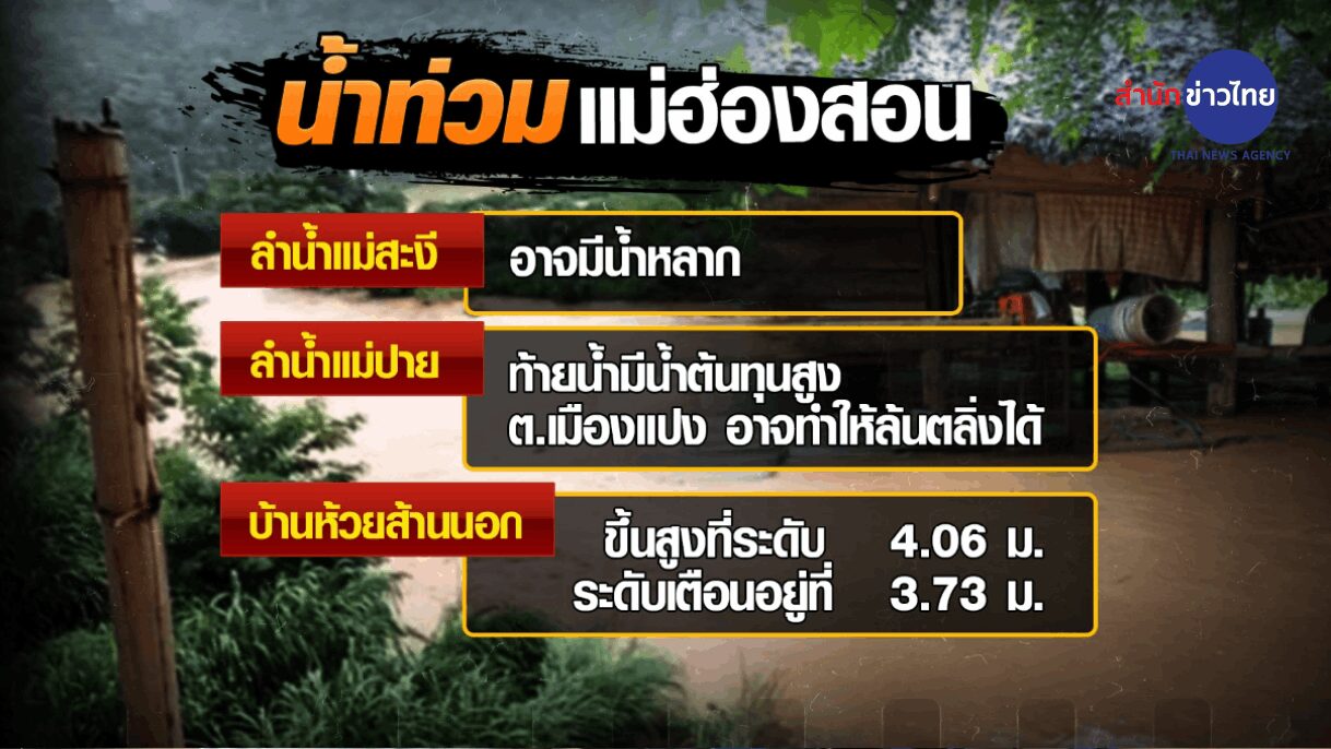 ที่บ้านห้วยผึ้ง ต.ห้วยผา อ.เมือง มีฝนสะสม 12 ชม. ส่งผลให้ลำน้ำแม่สะงี มีน้ำหลาก ลำน้ำแม่ปาย ระดับแนวตลิ่งลดลง แต่ทางท้ายน้ำมีน้ำต้นทุนสูงส่งผลให้มวลน้ำจะไหลลงไปท้ายน้ำ พื้นที่ ต.เมืองแปง ใกล้ล้นตลิ่ง ส่วนที่บ้านห้วย ส้านนอก ต.นาปู่ป้อม อ.ปางมะผ้า ระดับขึ้นสูง ที่ระดับ 4.03 ม. ระดับเตือนภัยอยู่ที่ 3.73ม.