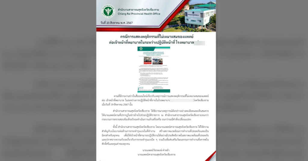 ล่าสุด นายวัชพงษ์ คำหล้า นายแพทย์สาธารณสุข จ.เชียงราย ประกาศผ่านเพจของสำนักงานสาธารณสุข จ.เชียงราย กรณีมีพฤติกรรมของแพทย์ต่อเจ้าหน้าที่พยาบาลในระหว่างปฏิบัติหน้าที่ในโรงพยาบาลว่า ทางสำนักงานสาธารณสุขจังหวัดเชียงราย พิจารณาเหตุการณ์อย่างละเอียดและเห็นสมควรให้นายแพทย์ตามที่ปรากฏในข่าวย้ายไปช่วยปฏิบัติราชการ ณ สำนักงานสาธารณสุข จ.เชียงราย จนกว่ากระบวนการตรวจสอบข้อเท็จจริงจะดำเนินการแล้วเสร็จ หรือจนกว่าจะมีคำสั่งเปลี่ยนแปลง.-สำนักข่าวไทย