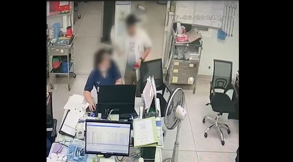 ภาพเหตุการณ์ที่นายแพทย์คนหนึ่งทำร้ายร่างกายพยาบาลสาว ด้วยการใช้มือทุบหลังพยาบาลสาว 2 ครั้ง เหตุเกิดเมื่อคืนวันเสาร์ที่ 17 ส.ค.ที่ผ่านมา โดยผู้ก่อเหตุเป็นหมอหนุ่มเพิ่งย้ายมาจากโรงพยาบาลรัฐ ในพื้นที่ข้างเคียง มาอยู่ที่โรงพยาบาลที่เกิดเหตุได้ไม่ถึงปี วันเกิดเหตุหมอหนุ่มสั่งงานพยาบาลสาว แต่ไม่แน่ชัดว่าเกิดปัญหาอะไร จนเกิดการทำร้ายร่างกายกันขึ้น