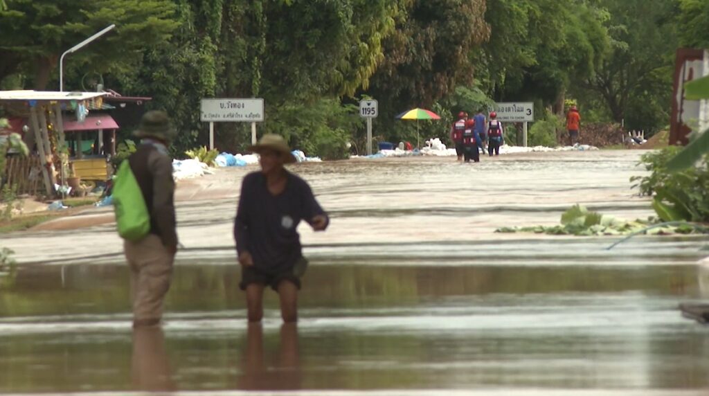 สุโขทัย 27 ส.ค. – อำเภอตอนเหนือของเมืองสุโขทัย ทั้งสวรรคโลกและศรีสำโรง ยังมีน้ำท่วมสูงและขยายวงกว้าง หลังมวลน้ำจาก จ.แพร่ ยังไหลมาเติม ชาวบ้านหวันน้ำจะท่วมสูงขึ้นอีก แต่ทำให้น้ำยมที่ไหลผ่านตัวเมืองสุโขทัยลดลง