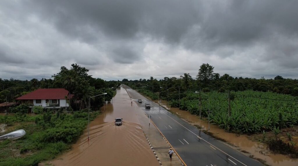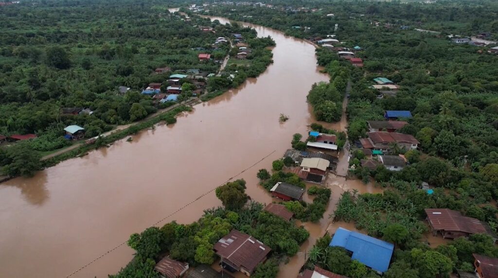 จากภาพมุมสูงในพื้นที่ อ.สวรรคโลก ซึ่งเป็นจุดรับน้ำหนักสุดจุดหนึ่งของสุโขทัย น้ำที่เคยท่วมถนนหน้าสนามบินสุโขทัย เป็นทางยาวกว่า 5 กิโลเมตร ตอนนี้น้ำลดลงเหลือท่วมบนผิวการจราจรบางส่วน รถสามารถสัญจรไปมาได้ รวมทั้งน้ำที่ท่วมตามบ้านเรือนใน ต.คลองกระจง เริ่มลดลง แต่ยังมีน้ำท่วมขังสูงกว่า 1 เมตร อย่างที่หมู่บ้านคลองกระจง ชาวบ้านยังเดือดร้อน เพราะยังต้องลุยน้ำเข้าออกบ้าน บางส่วนต้องตัดไฟฟ้า และถนนบางจุดขาด