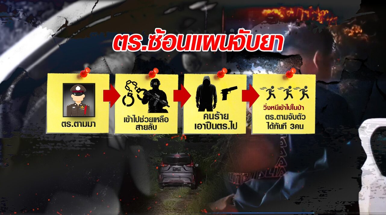 เมื่อเหตุการณ์พลิก ตำรวจที่ซุ่มจับกุมแก๊งค้ายา จึงนำกำลังบุกช่วยเหลือสายลับออกมา ส่วนแก๊งค้ายา เห็นท่าไม่ดี ต่างเผ่นหนีเข้าป่า แยกย้ายไปกันคนละทิศละทาง พร้อมนำปืนของสายลับไปด้วย อย่างไรก็ตาม 3 ใน 9 คน หนีไม่พ้นถูกรวบตัวทันควันในสภาพสะบักสะบอม 1 ในนั้นทราบชื่อคือนายอภิเชษฐ์ อายุ 44 ปี ชาวนนทบุรี จากนั้นไม่นาน ตำรวจสนธิกำลังกว่า 100 นาย ตามรวบผู้ร่วมขบวนการได้เพิ่มอีก 2 คน โดยจับได้ห่างจุดเกิดเหตุไปประมาณ 1 กิโลเมตร ที่เหลืออีก 4 คน อยู่ระหว่างติดตามไล่ล่า โดยตำรวจฝากเตือนประชาชนให้ระมัดระวัง เพราะคนที่ยังไม่ถูกจับกุมน่าจะมีอาวุธปืนติดตัวไปด้วย