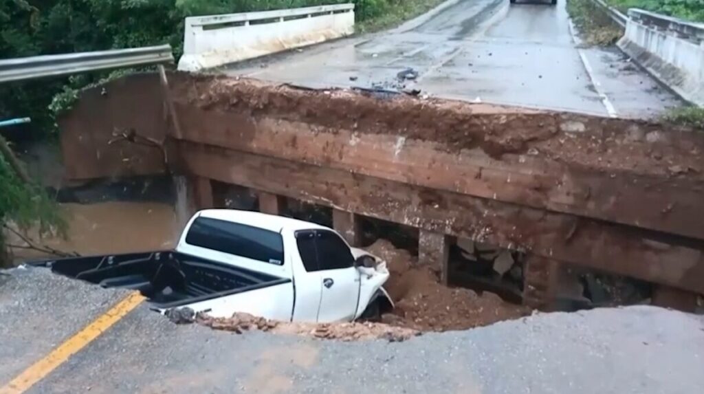 ตาก 4 ก.ย.-ฝนถล่ม อ.อุ้มผาง จ.ตาก น้ำป่าหลากกัดเซาะคอสะพานขาด ถนนสายแม่สอด-อุ้มผาง รถกระบะขับผ่านมาพอดี หยุดไม่ทัน รถทั้งคันพุ่งตกลงไป คนขับบาดเจ็บ