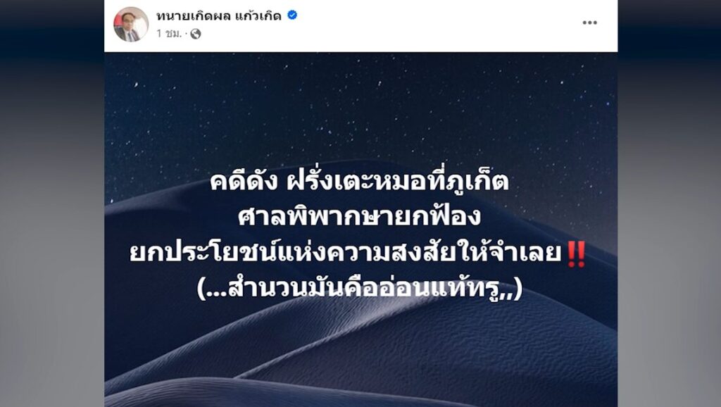 ซึ่งหลังศาลมีคำพิพากษา ทนายเกิดผล แก้วเกิด โพสต์เฟซบุ๊ก ระบุว่า คดีดังฝรั่งเตะหมอที่ภูเก็ตศาลพิพากษา ยกฟ้องยกประโยชน์แห่งความสงสัยให้จำเลย พร้อมระบุว่า “สำนวนมันคืออ่อน”