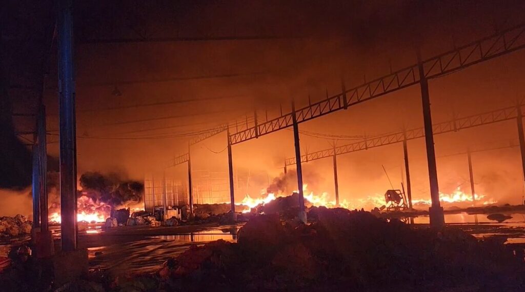 ไฟไหม้โรงงานรีไซเคิลของเก่าและผลิตพลาสติก ต.บางหญ้าแพรก จ.สมุทรสาคร กลางดึกเมื่อคืนที่ผ่านมา เจ้าหน้าที่ดับเพลิงระดมฉีดน้ำ เพื่อควบคุมเพลิงที่ไหม้ภายในโรงงาน ไม่ให้ลุกลามไปยังชุมชนและพื้นที่ใกล้เคียง ล่าสุดเมื่อเวลา 09.00 น. ที่ผ่านมา เพลิงยังคุกรุ่นมีควันขึ้นมาตลอดเวลา