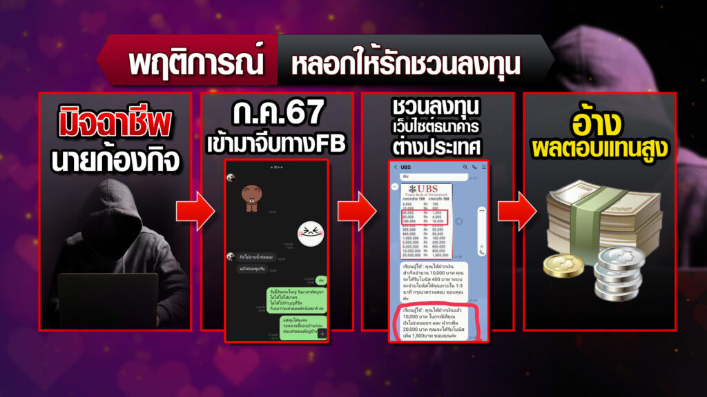 น.ส.ศุภธิดา (นามสมมติ) อายุ 46 ปี เข้าแจ้งความต่อพนักงานสอบสวน สภ.บางบัวทอง บอกว่าเมื่อช่วงต้นเดือน ก.ค.ที่ผ่านมา นายก้องกิจทักเข้ามาหาผ่านทางเฟซบุ๊ก ลักษณะเป็นการขอจีบและได้คุยกัน กระทั่งวันที่ 5 ส.ค. นายก้องกิจชวนลงทุนแลกเปลี่ยนเงินดิจิทัลผ่านทางเว็บไซต์ UBS Union bank of switzerland อ้างว่าเป็นเว็บไซต์ของธนาคารต่างประเทศ โดยบอกว่าจะได้ผลตอบแทนสูง