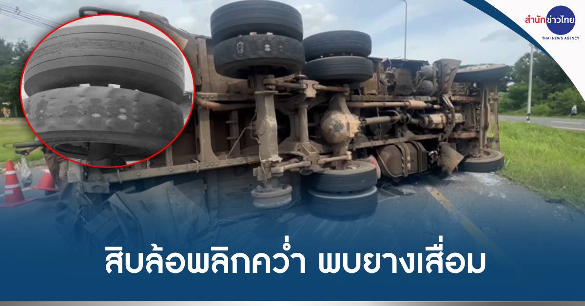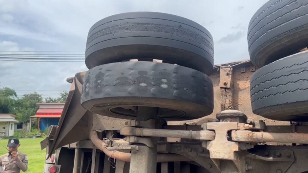 ด้านตำรวจชี้ให้ดูว่ายางรถสิบล้อที่พลิกคว่ำคันนี้ ตรวจสอบแล้วพบว่าเป็นนยางดีเพียง 2 เส้นก็คือ 2 ล้อหน้า ส่วนที่เหลือพบว่าเสื่อมสภาพทุกล้อ ถึงกับลวดยางโผล่ออกมา