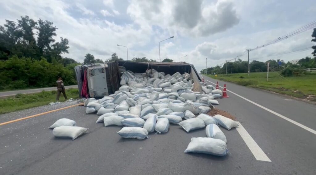 รถสิบล้อพลิกคว่ำเมื่อช่วงเช้าวันนี้ 8 กันยายน บนถนนระหว่างหลักกิโลเมตรที่ 132-133 ถนนโชคชัย-เดชอุดม อ.เฉลิมพระเกียรติ จ.บุรีรัมย์ จนทำให้กระสอบขี้ไก่ที่บรรทุกมา ร่วงกระจายเกลื่อนถนน ต้องปิดการจราจรครึ่งช่องทาง