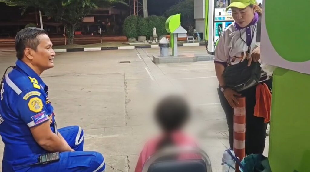 น้องน้ำ อายุ 8 ขวบ กำลังนั่งอยู่กับพี่ๆ พนักงานปั๊มน้ำมัน บนถนนสายบุรีรัมย์-นางรอง เมื่อเวลา 21.30 น. ของวันที่ 8 ก.ย.ที่ผ่านมา มีพลเมืองดีพบเห็นน้องใส่ชุดพละ สะพายกระเป๋า เดินอยู่บนถนนมืดๆ คนเดียว จึงพามาฝากไว้ที่ปั๊มน้ำมัน เพราะดึกแล้ว กลัวจะไม่ปลอดภัย