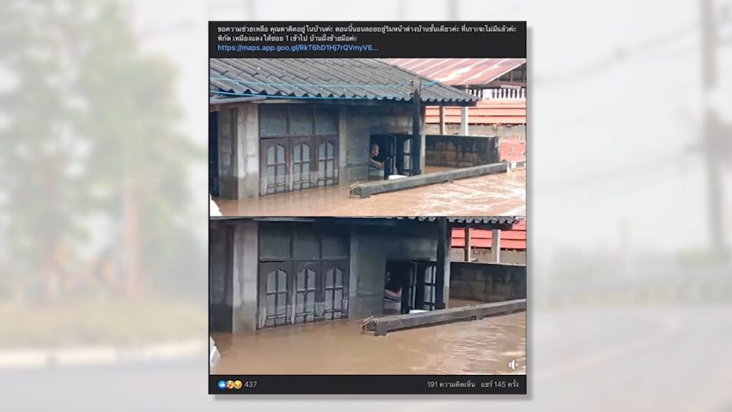 เช่น ผู้ใช้เฟซบุ๊ครายนี้ โพสต์ขอความช่วยให้คุณตา ในพื้นที่เหมืองแดงใต้ซอย 1 ตำบลแม่สายซึ่งเป็นอีก 1 พื้นที่ที่มีคนติดอยู่ในบ้านพักเป็นจำนวนมาก โดยระบุว่าขณะนี้น้ำท่วมสูง คุณตารายนี้ต้องนอนลอยอยู่ริมน้ำต่างบ้านบ้านพักชั้นเดียว ไม่มีที่จะเกาะ