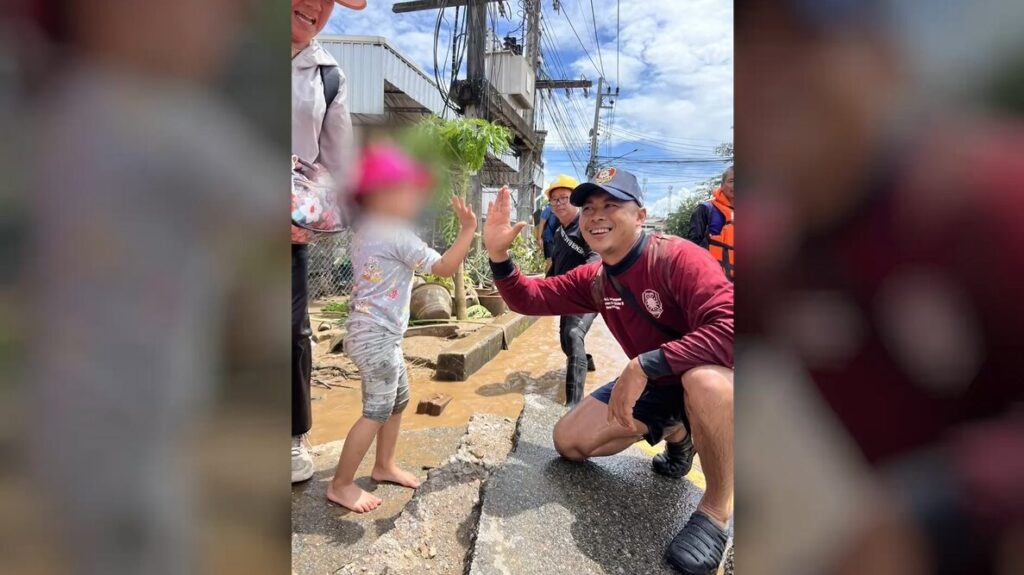 เมื่อน้ำยังไม่ลด ภารกิจก็ยังไม่สิ้นสุด เจ้าหน้าที่ตำรวจน้ำยังคงฝ่าฟันกระแสน้ำเข้าช่วยเหลือชาวบ้านทุกอย่างต่อเนื่อง ซึ่งระดับน้ำวันนี้ที่บ้านเกาะทราย แม่สาย ยังคงเท่าเดิม เพราะเมื่อค่ำคืนที่ผ่านมา มีฝนตกหนักจนถึงรุ่งเช้าของวันนี้ และการฝ่าน้ำไปแม้ว่าจะยากลำบากในการเข้าไปช่วยเหลือ แต่ในสถานการณ์แบบนี้เราก็มีโอกาสได้เห็นภาพน่ารักๆ เมื่อตำรวจน้ำทำไฮไฟว์แท็กมือกับเด็กก่อนจะลุยน้ำ ให้ความมั่นใจว่าเราจะไปด้วยกัน