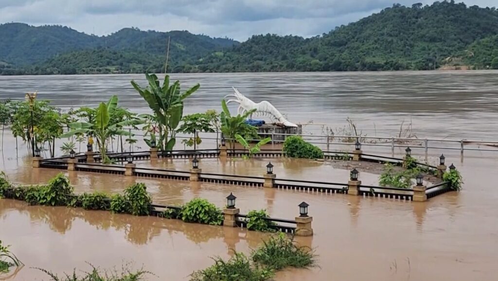 บริเวณแม่น้ำโขง ริมถนนคนเดินเชียงคาน จ.เลย ซึ่งเป็นพื้นที่ลุ่มต่ำ ระดับน้ำเริ่มทะลักเข้าพื้นที่แล้ว โดยจุดวัดระดับแม่น้ำโขง หน้าอุทกวิทยาเลย อ.เชียงคาน เมื่อช่วงเช้า วัดระดับน้ำล่าสุดได้ 16.35 เมตร ซึ่งปกติจุดวิกฤติจะอยูที่ 16 เมตร ขณะที่ช่วงบ่ายระดับน้ำลดลงอยู่ที่ 16.25 เมตร ทั้งนี้ ระดับน้ำโขง ยังได้ไหลดันแม่น้ำสาขา เช่น แม่น้ำฮวย หลากท่วมช่วงริมถนนสายหลัก ช่วงสะพานข้ามแม่น้ำฮวย รวมถึงไร่นา รีสอร์ต ตามริมแม่น้ำฮวย ใน ทื้นที่อำเภอเชียงคาน แล้ว