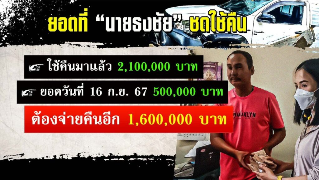 วานนี้ (16 ก.ย.) พ.ต.อ.ภคิน วรรณศรี ผู้กำกับการสถานีตำรวจภูธรหนองฉาง พร้อมด้วย ร้อยเวร สภ.หนองฉาง ลงพื้นที่ตรวจสอบยังจุดที่เกิดเหตุอีกครั้ง ในที่สุด ความจริงก็เปิดเผย นายธงชัย สารภาพว่า เงินที่หายไป ไม่ได้จมน้ำ แต่เอาไปใช้เอง ยอดเงินจากการขายรถ 4,200,000 บาท เจอในรถที่จมน้ำ 500,000 บาท เท่ากับว่าเงินหายไป 3,700,000 บาท นายธงชัยสารภาพว่าเอาเงินไปใช้แล้ว เหลืออยู่ 2,100,000 บาท จึงเจรจาไกล่เกลี่ยกับ นางทองดี อายุ 58 ปี ซึ่งเป็นเจ้าของ 18 ล้อ ที่นายธงชัย ขายต่อให้ และเจรจากับ นางสาวิตตรี เจ้าของเงิน ว่าจะคืนเงินให้ก้อน 2 ก้อน คือ 2,100,000 บาท กับ 500,000 บาท ที่จมน้ำ รวม 2,600,000 บาท ส่วนอีก 1,600,000 บาท นายธงชัย ขอผ่อนชำระรายเดือน เดือนละ 50,000 บาท แต่ทางนางทองดี ไม่ยอมให้ผ่อนชำระ อยากได้เป็นยอดเงินก้อนใหญ่ หรือไม่ก็ให้เอาทรัพย์สินที่มีมูลค่าสูง มาจ่ายทดแทน