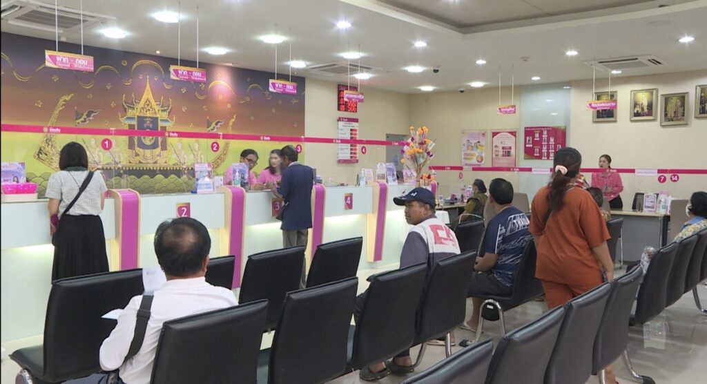 บรรยากาศหน้าธนาคารออมสินย่านศาลากลาง จ.ขอนแก่น พบประชาชนที่ได้รับเงิน 10,000 บาท มารอถอนเงินสดตั้งแต่เช้า ส่วนใหญ่จะมาถอนเงินผ่านสมุดบัญชีธนาคาร