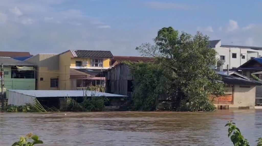 ลำปาง 27 ก.ย. – ระดับน้ำในแม่น้ำวัง เขตเทศบาลนครลำปาง ท่วมสู่ระดับอันตรายแล้ว ชาวบ้านเร่งนำกระสอบทรายมากั้นบริเวณประตูทางเข้าบ้าน