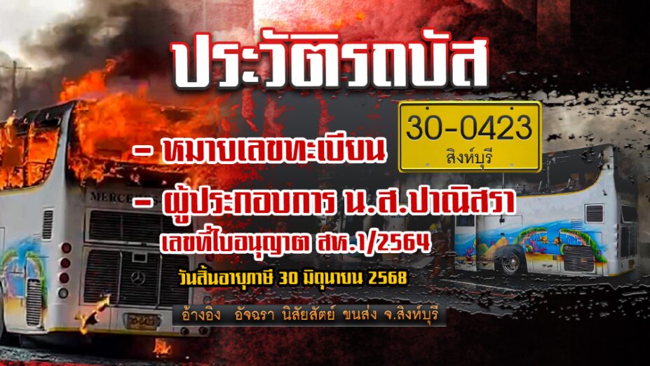 นอกจากนี้ ผู้สื่อข่าวไปที่สำนักงานขนส่งจังหวัดสิงห์บุรี พบ นางอัจฉรา นิสัยสัตย์ ขนส่ง จ.สิงห์บุรี เปิดเผยว่า จากการเช็ก GPS ของรถคันที่เกิดเหตุทราบว่า เป็นของผู้ประกอบการชื่อ น.ส.ปาณิสรา วันสิ้นอายุภาษี 30 มิถุนายน 2568 สำหรับเรื่องประตูรถฉุกเฉินได้มาตรวจสภาพครั้งล่าสุดวันที่ 23 พฤษภาคม 2567 มีสภาพแข็งแรงใช้งานได้ตามปกติ และขณะเกิดเหตุเวลา 12.07 น. รถใช้ความเร็วในการขับอยู่ที่ 81 กม./ชม. โดยรถคันนี้ใช้แก๊ส NGV ถังแก๊สใช้งานมาแล้ว 15 ปี และจะหมดอายุในปี 2569 สำหรับสาเหตุของอุบัติเหตุในครั้งนี้ต้องรถผลการพิสูจน์หลักฐานของเจ้าหน้าที่ตำรวจอีกครั้งว่าเกิดจากสาเหตุอะไร แต่รถคันนี้ได้ทำประกันชั้น 3 ไว้