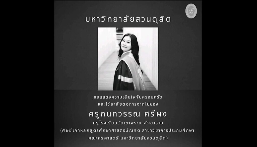 มหาวิทยาลัยสวนดุสิต โพสต์แสดงความเสียใจกับครอบครัว และไว้อาลัยต่อการจากไปของครูกนกวรรณ ศรีผง หรือ ครูสาวร้อย ครูโรงเรียนวัดเขาพระยาสังฆาราม (ศิษย์เก่าหลักสูตรศึกษาศาสตรบัณฑิต สาขาวิชาการประถมศึกษา คณะครุศาสตร์ มหาวิทยาลัยสวนดุสิต) โดยระบุว่า ครูกนกวรรณ เพิ่งเข้ารับพระราชทานปริญญาบัตร เมื่อ 26กันยายน ที่ผ่านมา จบการศึกษาหลักสูตรศึกษาศาสตรบัณฑิต สาขาวิชาการประถมศึกษา เกียรตินิยมอันดับ 2 คณะครุศาสตร์ มหาวิทยาลัยสวนดุสิต