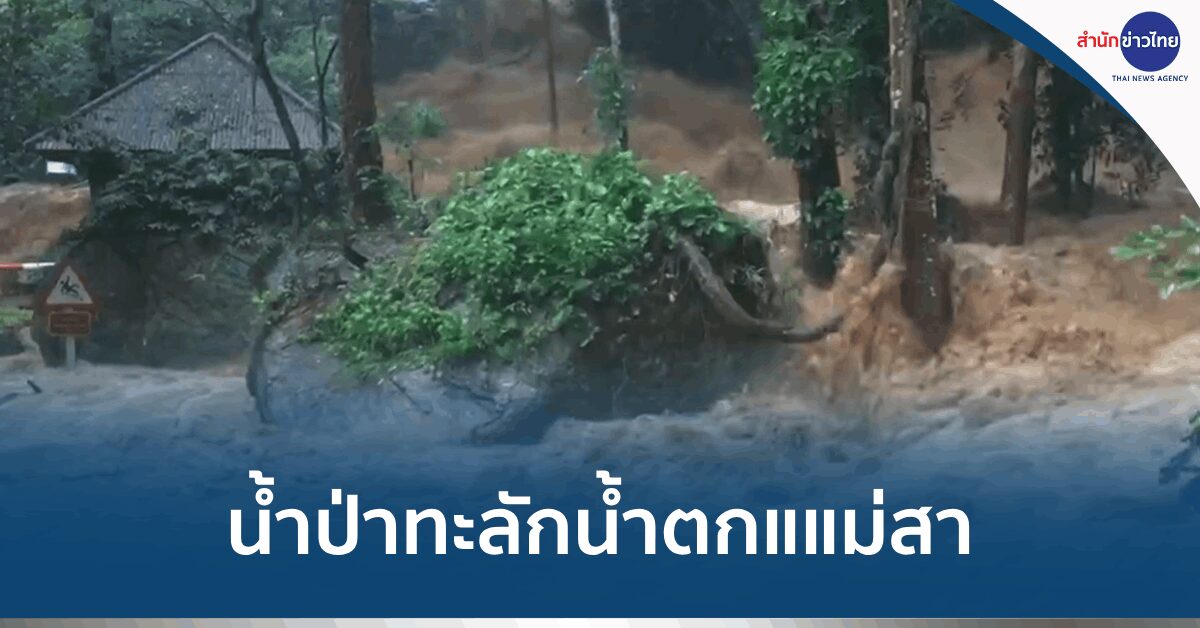 น้ำป่าสีแดงขุ่นไหลหลากลงลำน้ำแม่สา ในพื้นที่อำเภอแม่ริม จังหวัดเชียงใหม่ หลังฝนตกหนักตลอดทั้งคืนจนถึงเช้าวันนี้ ปริมาณน้ำเพิ่มสูงขึ้น และกระแสน้ำไหลเชี่ยวรุนแรงกว่าทุกวัน เจ้าหน้าที่ต้องสั่งปิด และห้ามเข้าใกล้น้ำตก เกรงว่าจะเป็นอันตราย ระดับน้ำยังสูงขึ้น และประกาศแจ้งเตือนประชาชนที่อยู่ลุ่มน้ำแม่สาทั้ง 2 ฝั่ง ในอำเภอแม่ริม ให้ระวังอันตราย และน้ำป่าไหลหลาก ก่อนมวลน้ำจะลงไปสมทบลงในแม่น้ำปิง และส่งผลให้น้ำแม่ปิงสูงขึ้นอีก