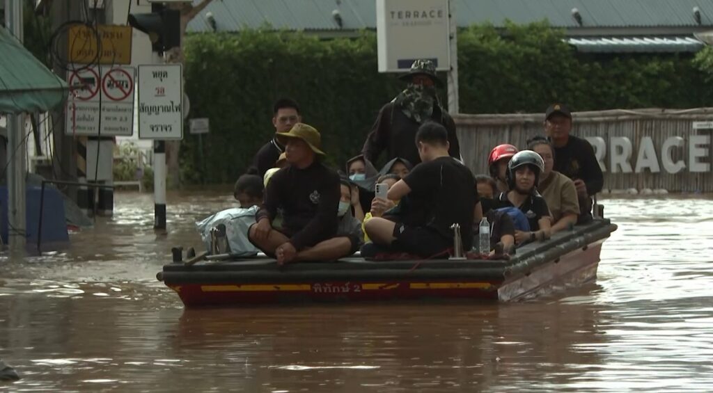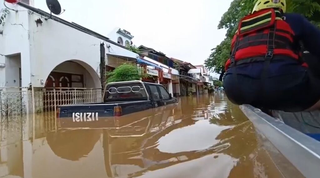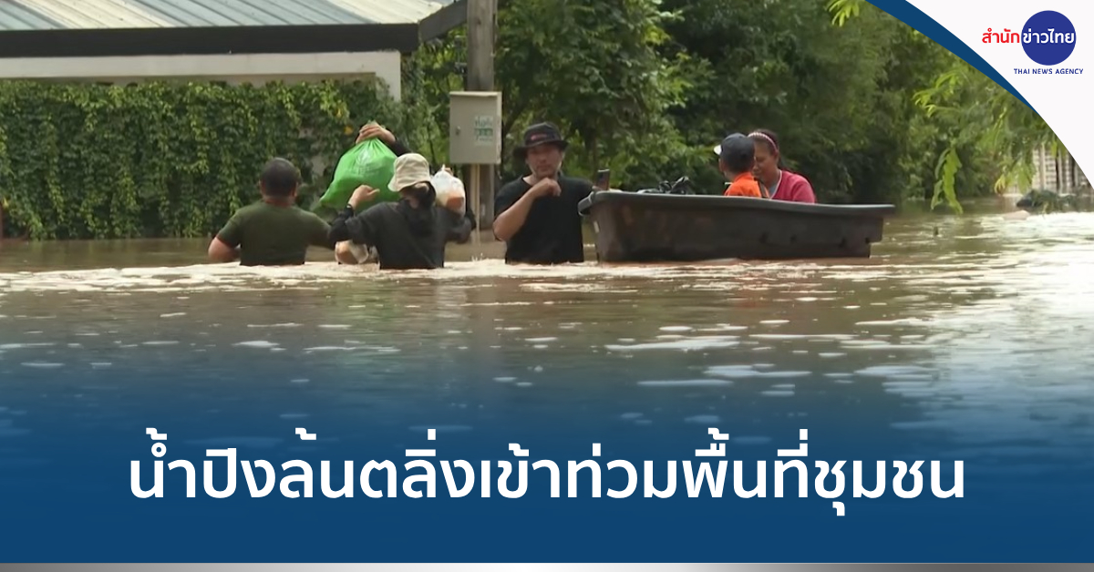 เชียงใหม่ 4 ต.ค. – น้ำปิงสูงขึ้นอย่างต่อเนื่อง ทำให้น้ำล้นตลิ่งเข้าท่วมพื้นที่ชุมชนและย่านการค้า ระดับน้ำสูงเกือบ 2 เมตร หลังมีฝนตกลงมาอย่างหนัก