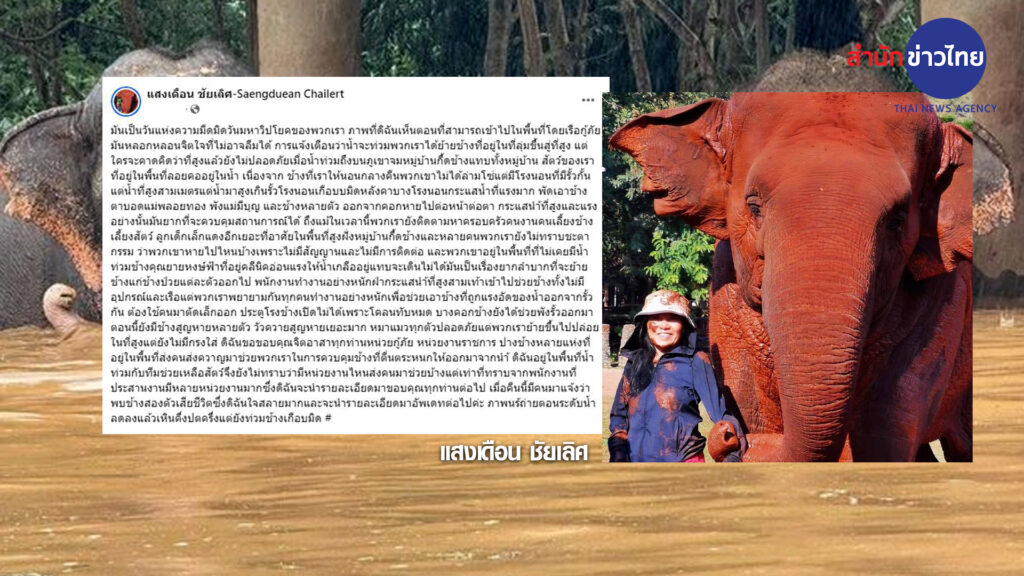 “มันเป็นวันแห่งความมืดมิดวันมหาวิปโยคของพวกเรา ภาพที่ดิฉันเห็นตอนที่สามารถเข้าไปในพื้นที่โดยเรือกู้ภัยมันหลอกหลอนจิตใจที่ไม่อาจลืมได้ การแจ้งเตือนว่าน้ำจะท่วมพวกเราได้ย้ายช้างที่อยู่ในที่ลุ่มขึ้นสู่ที่สูง แต่ใครจะคาดคิดว่าที่สูงแล้วยังไม่ปลอดภัยเมื่อน้ำท่วมถึงบนภูเขาจมหมู่บ้านกึ้ดช้างแทบทั้งหมู่บ้าน สัตว์ของเราที่อยู่ในพื้นที่ลอยคออยู่ในน้ำ เนื่องจาก ช้างที่เราให้นอนกลางคืนพวกเขาไม่ได้ล่ามโซ่แต่มีโรงนอนที่มีรั้วกั้น แต่น้ำที่สูงสามเมตรแต่น้ำมาสูงเกินรั้วโรงนอนเกือบมิดหลังคาบางโรงนอนกระแสน้ำที่แรงมาก พัดเอาช้างตาบอดแม่พลอยทอง พังแม่มีบุญ และช้างหลายตัว ออกจากคอกหายไปต่อหน้าต่อตา กระแสน้ำที่สูงและแรงอย่างนั้นมันยากที่จะควบคุมสถานการณ์ได้ ถึงแม้ในเวลานี้พวกเรายังติดตามหาครอบครัวคนงานคนเลี้ยงช้างเลี้ยงสัตว์ ลูกเด็กเล็กแดงอีกเยอะที่อาศัยในพื้นที่สูงฝั่งหมู่บ้านกึ้ดช้างและหลายคนพวกเรายังไม่ทราบชะตากรรม ว่าพวกเขาหายไปไหนบ้างเพราะไม่มีสัญญานและไม่มีการติดต่อ และพวกเขาอยู่ในพื้นที่ที่ไม่เคยมีน้ำท่วมช้างคุณยายหงษ์ฟ้าที่อยู่คลีนิคอ่อนแรงให้น้ำเกลืออยู่แทบจะเดินไม่ได้มันเป็นเรื่องยากลำบากที่จะย้ายช้างแก่ช้างป่วยแต่ละตัวออกไป พนักงานทำงานอย่างหนักฝ่ากระแสนำ้ที่สูงสามเท้าเข้าไปช่วยช้างทั้งไม่มีอุปกรณ์และเรือแต่พวกเราพยายามกันทุกคนทำงานอย่างหนักเพื่อช่วยเอาช้างที่ถูกแรงอัดของน้ำออกจากรั้วกัน ต้องใช้คนมาตัดเล็กออก ประตูโรงช้างเปิดไม่ได้เพราะโคลนทับหมด บางคอกช้างยังได้ช่วยพังรั้วออกมา ตอนนี้ยังมีช้างสูญหายหลายตัว วัวควายสูญหายเยอะมาก หมาแมวทุกตัวปลอดภัยแต่พวกเราย้ายขึ้นไปปล่อยในที่สูงแต่ยังไม่มีกรงใส่ ดิฉันขอขอบคุณจิตอาสาทุกท่านหน่วยกู้ภัย หน่วยงานราชการ ปางช้างหลายแห่งที่อยู่ในพื้นที่ส่งคนส่งควาญมาช่วยพวกเราในการควบคุมช้างที่ตื่นตระหนกให้ออกมาจากนำ้ ดิฉันอยู่ในพื้นที่น้ำท่วมกับทีมช่วยเหลือสัตว์จึงยังไม่ทราบว่ามีหน่วยงานไหนส่งคนมาช่วยบ้างแต่เท่าที่ทราบจากพนักงานที่ประสานงานมีหลายหน่วยงานมากซึ่งดิฉันจะนำรายละเอียดมาขอบคุณทุกท่านต่อไป เมื่อคืนนี้มีคนมาแจ้งว่าพบช้างสองตัวเสียชีวิตซึ่งดิฉันใจสลายมากและจะนำรายละเอียดมาอัพเดทต่อไปค่ะ”