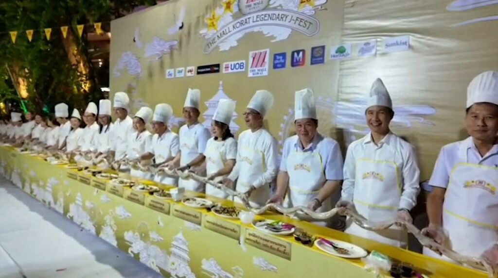 ส่วนลานมอลล์พาร์ค และหน้าศูนย์การค้าเดอะมอลล์โคราช ทำพิธีเปิดงาน “THE MALL KORAT 25th LEGENDARY J-FEST เจทั่วทิศ กุศลจิตทั่วไทย ครั้งที่ 25” มีรองผู้ว่าราชการจังหวัดนครราชสีมา/ภาครัฐและเอกชน /สมาคมคนไทยเชื้อสายจีนในจังหวัด ร่วมกันปรุงเมนูเจ “ก๋วยเตี๋ยวหลอดเจ 8 เซียน ความยาว 88 เมตร” ซึ่งถือเป็นไฮไลท์ของงาน โดยใช้วัตถุดิบน้ำหนักรวมกว่า 288 กิโลกรัม แจกให้กับประชาชนที่มาร่วมงานกว่า 1,888 จาน โดยเลข 8 เป็นเลขมงคลในหลายวัฒนธรรมทั่วโลก เชื่อว่า เป็นเลขแห่งความโชคดี ความสุข ความเจริญรุ่งเรือง และความสำเร็จ.-สำนักข่าวไทย