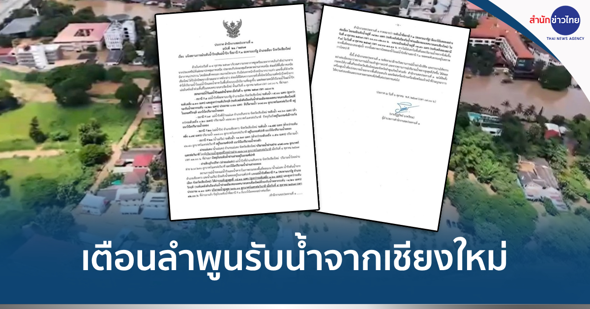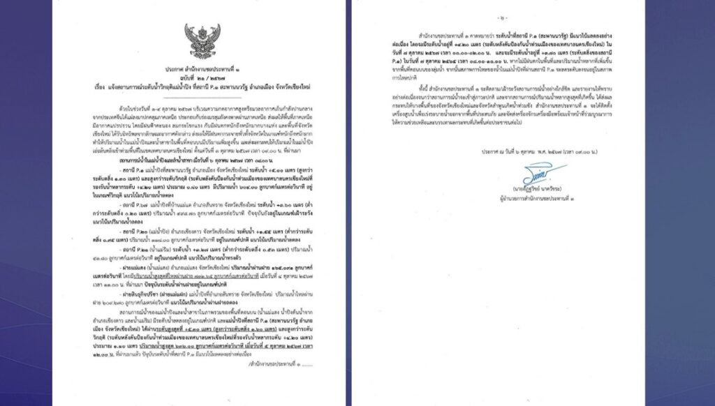 ลำพูน 7 ต.ค. – กรมชลประทาน ประกาศเตือน จ.ลำพูน หลายพื้นที่ เตรียมรับมวลน้ำมหาศาลจาก อ.สารภี จ.เชียงใหม่
