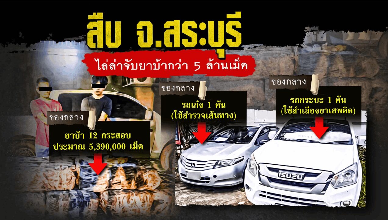 สระบุรี 8 ต.ค. – ตำรวจสืบสวนสอบสวนภูธรจังหวัดสระบุรี ร่วมกับเจ้าหน้าที่ทหาร ขยายผลจับผู้ต้องหาพร้อมยาบ้ากว่า 5.3 ล้านเม็ด มูลค่ากว่า 100 ล้านบาท