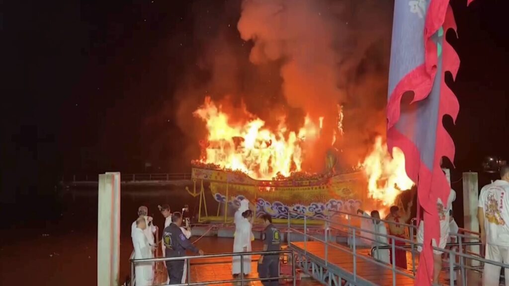 ทั้งนี้ การเผาเรือกลางคลองแม่กลองพร้อมเครื่องบูชาต่างๆ เช่น หีบเงินหีบทอง, ดอกบัว, โคมไฟ, ชุดเทพเจ้า, แจกัน, กระดาษเงิน, กระดาษทอง และยังจุดประทัดจำนวนมาก รวมมูลค่ากว่าล้านบาท ดังสนั่นไปทั้งลำน้ำแม่กลอง ผู้มีจิตศรัทธาร่วมกันถวายส่งเทพเจ้ากิ้วฮ้วงฮุกโจ้วขึ้นสวรรค์ ตามความเชื่อ เป็นอันสิ้นสุดเทศกาลถือศีลกินเจประจำปี 2567 .-สำนักข่าวไทย