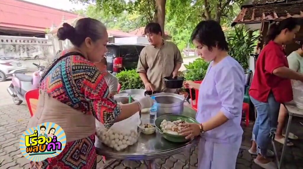 เจ้าหน้าที่ของวัดขะช่วยกันจัดเตรียม แบ่งกันจัดเตรียมผัก เส้นหมี่ขาว ลูกชิ้นหมู-เนื้อ หมูเปื่อย เนื้อเปื่อย จัดเตรียมใส่ชามไว้ ส่วนน้ำซุปมีทั้งน้ำซุปก๋วยเตี๋ยวเนื้อ น้ำซุปก๋วยเตี๋ยวหมู