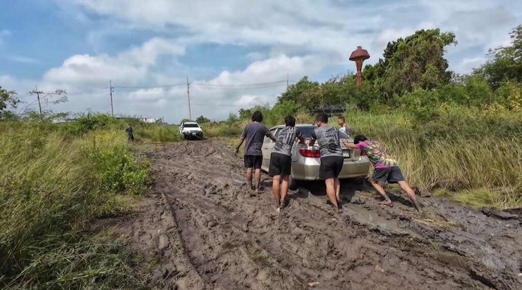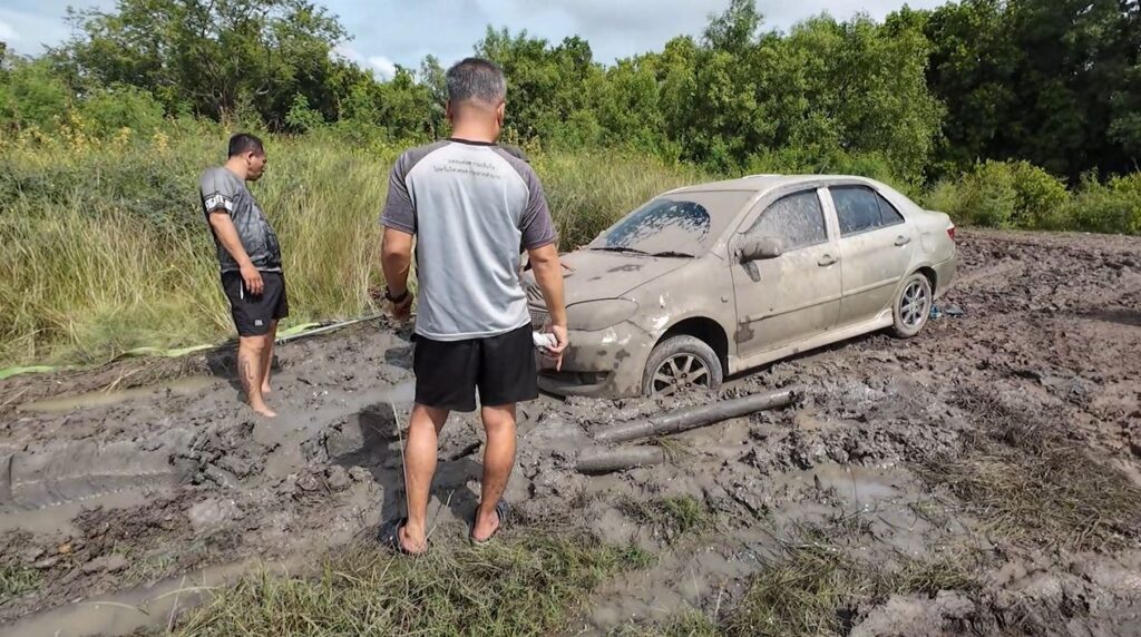 เจ้าหน้าที่กู้ภัยขับรถเข้าไปหวังจะช่วยลากรถเก๋งทั้ง 2 คันออกมา แต่รถเกิดติดหล่ม เพราะโคลนบริเวณนั้นเป็นดินเหนียว ยิ่งขับยิ่งจมลง จึงประสานกลับมายังหน่วยให้ส่งเจ้าหน้าที่และรถออฟโรดมาช่วยสนับสนุนอีก 3 คัน