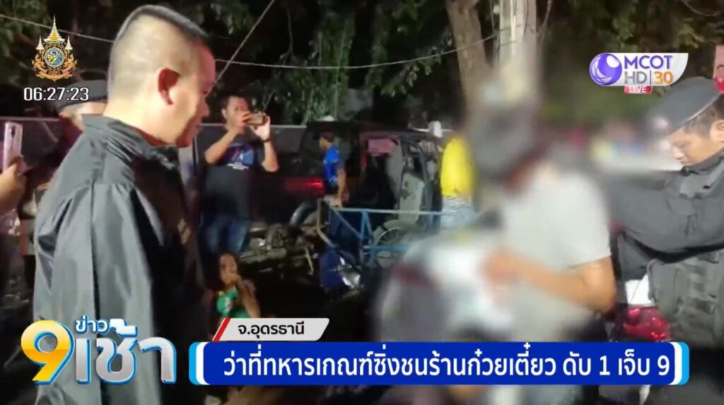 อุดรธานี 25 ต.ค. – ว่าที่ทหารเกณฑ์หนุ่มซิ่งรถกระบะพุ่งชนร้านก๋วยเตี๋ยวริมทางที่มีลูกค้านั่งอยู่เต็มร้าน เสียชีวิต 1 คน บาดเจ็บ 9 คน