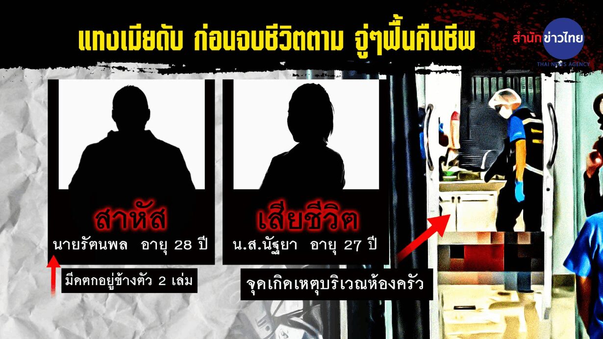 ที่เกิดเหตุ อยู่ในบริเวณห้องครัว พบร่างหญิงและชาย ทราบชื่อ คือ นางสาวนัฐญา อายุ 27 ปี และนายรัตนพล อายุ 28 ปี ซึ่งเป็นสามีภรรยา อยู่ใน ลักษณะฝ่ายชายคว่ำหน้า กอดทับอยู่ด้านบนของฝ่ายหญิง ใกล้กันพบมีดทำครัวยาวประมาณ 5 นิ้ว เปื้อนเลือดตกอยู่ 2 เล่ม มีข้าวของกระจัดกระจาย และ คราบเลือดกระจายเต็มพื้นห้องครัว ลักษณะเหมือนการต่อสู้กัน เบื้องต้น เจ้าหน้าที่คิดว่าทั้งคู่เสียชีวิตแล้ว เพราะไม่มีสัญญาชีพ แต่ระหว่างที่พิสูจน์หลักฐาน และแพทย์กำลังชันสูตรปรากฏว่า จู่ๆ ฝ่ายชายมีชีพจร และฟื้นขึ้นมา โดยตามร่างกาย พบบาดแผลบริเวณใต้ราวนมด้านขวา 1 จุด และบริเวณคอ 1 จุด ถามตอบรู้เรื่อง แต่ไม่สามารถลืมตาได้ โดยทางเจ้าหน้าที่กู้ภัยได้รีบนำตัวส่งโรงพยาบาลศรีมหาโพธิเพื่อรักษาตัวต่อไป